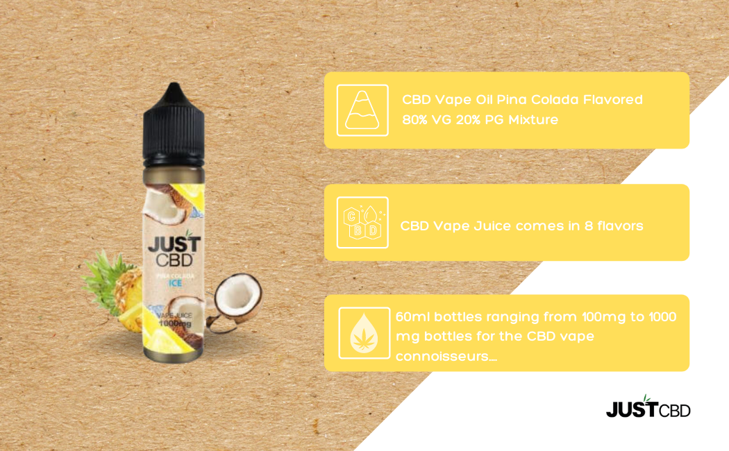 If you appreciate the spectacular blend of coconut and pineapple, Just CBD Pina Colada Ice is the oil vape for you. With each appetizing puff, you can envision your toes in the sand on one of the picturesque beaches of Hawaii. Whether you are looking to relax after a long day at work, trying to fall asleep or simply craving a savory vape, you can’t go wrong with Pina Colada Ice Vape.
